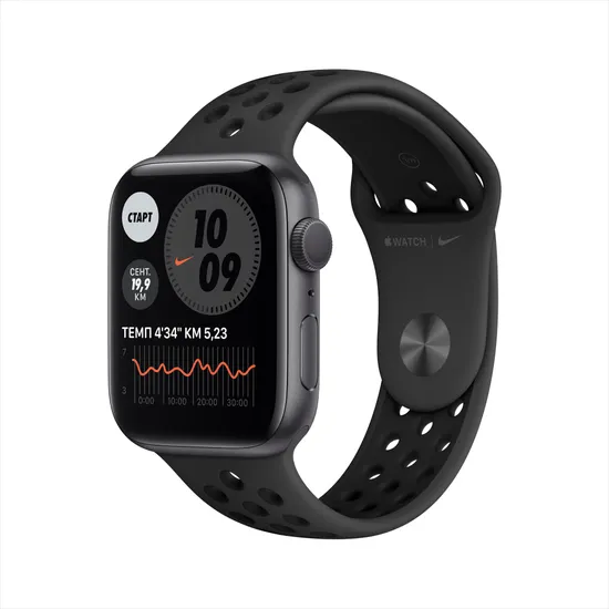 Apple Watch Nike Series 6, 44 мм, корпус из алюминия цвета «серый космос», спортивный ремешок Nike цвета «антрацитовый/чёрный»