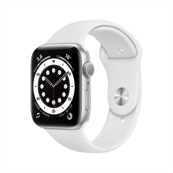 Apple Watch Series 6, 44 мм, корпус из алюминия серебристого цвета, спортивный ремешок белого цвета